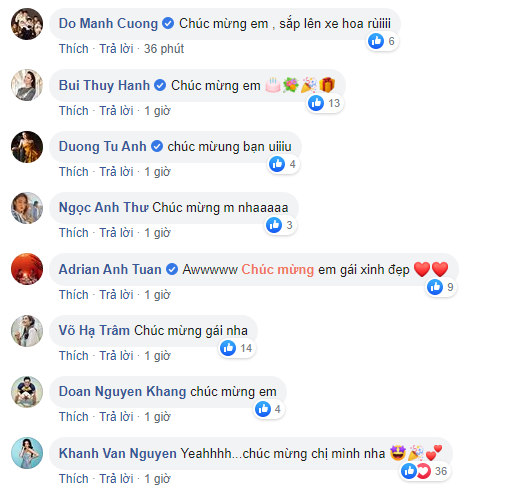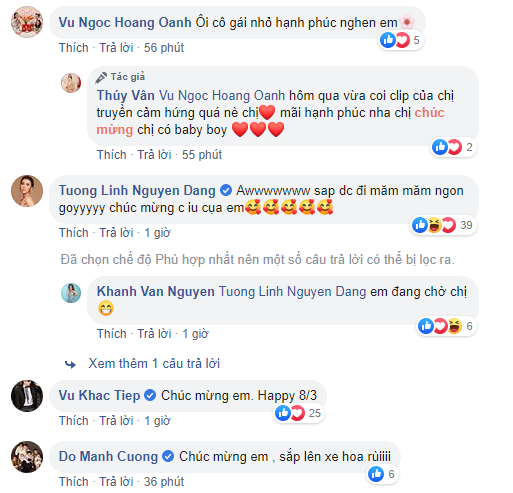 Cô chia sẻ: "Ngày 8/3 hạnh phúc nhất cuộc đời mình". Ngay sau khi Thúy Vân đăng bức ảnh lên trang cá nhân, một loạt sao Việt như Hoa hậu Khánh Vân, Á hậu Hoàng Oanh, Tú Anh, Tường Linh, NTK Đỗ Mạnh Cường, ông bầu Vũ Khắc Tiệp,... cũng đã để lại bình luận chúc mừng.