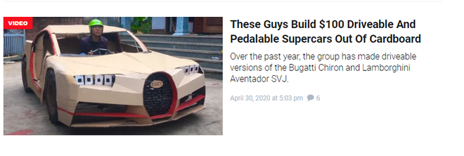 Một nhóm Youtuber Việt mới đây đã xuất hiện trang tin xe hơi quốc tế Carscoops và fanpage của nữ reviewer Supercar Blondie bởi hàng loạt video tự chế siêu xe bằng bìa các-tông. Nhiều người đọc quốc tế đã không khỏi ngạc nhiên trước khả năng của nhóm Youtuber này.