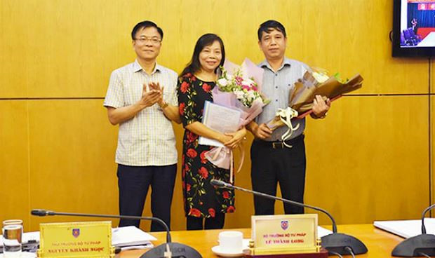 Bộ trưởng Lê Thành Long trao quyết định cho ông Hoàng Thế Anh và bà Nguyễn Thị Kim Thoa. Ảnh: baophapluat.vn |