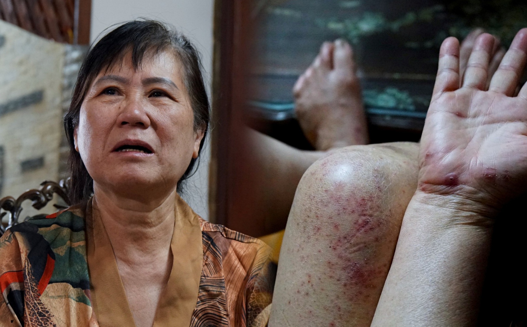 Người đàn bà 60 tuổi vén quần để lộ vết thâm ở đùi, đầu gối và đôi bàn tay đầy vết dăm đá đâm vào. Bà khẽ nói bản thân bà ở tuổi này bịa chuyện ra chẳng được lợi lộc gì.