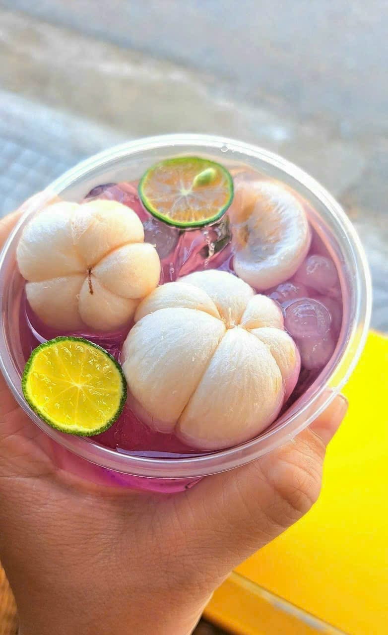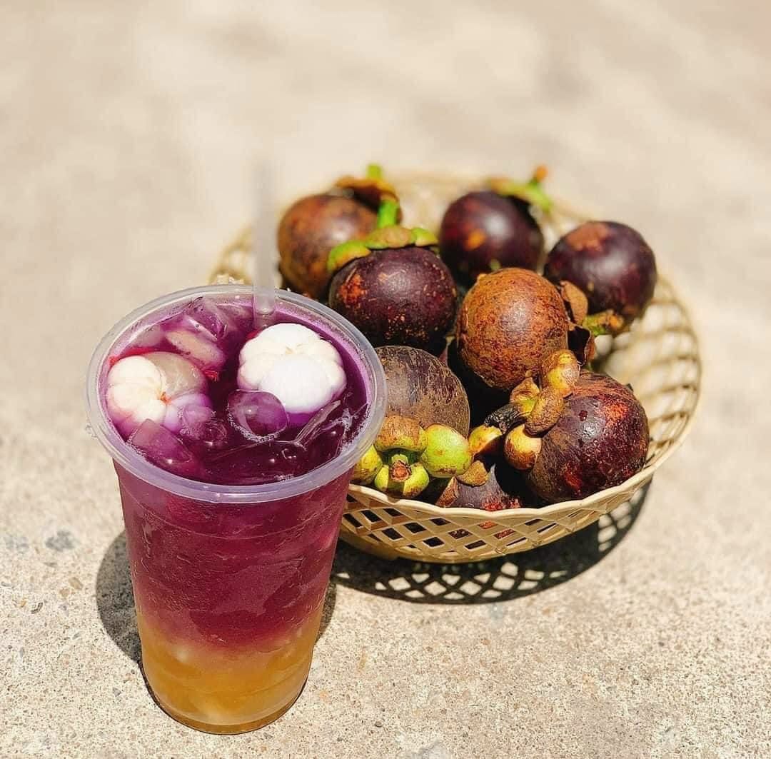 Nếu như món gỏi gà hot hit làm bằng măng cụt xanh thì người ta cũng sáng tạo thêm với măng cụt chín. Vẫn là cách làm thông thường như các loại trà hoa quả tươi khác, song, với măng cụt thì sẽ kết hợp cùng hoa đậu biếc, để cho ra những ly trà vừa có màu tím đẹp mắt, vừa có vị chua dịu, ngọt thanh, càng uống càng mê.