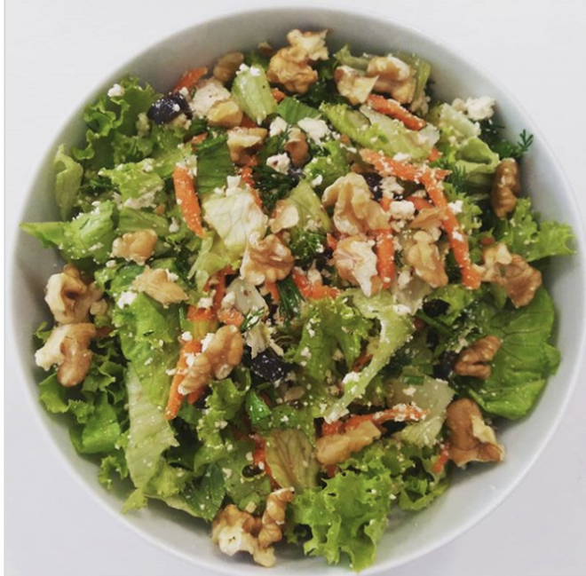 - Bữa trưa: salad rau, bưởi, 1 lát bánh mì nướng, cà phê đen.
