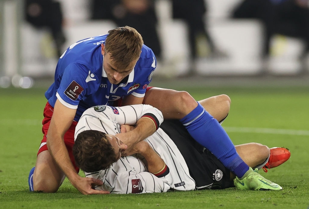 (Tổ Quốc) - Khuôn mặt của Leon Goretzka hứng trọn gầm giày của Jens Hofer trong trận Đức 9-0 Liechtenstein (bảng J vòng loại World Cup 2022).