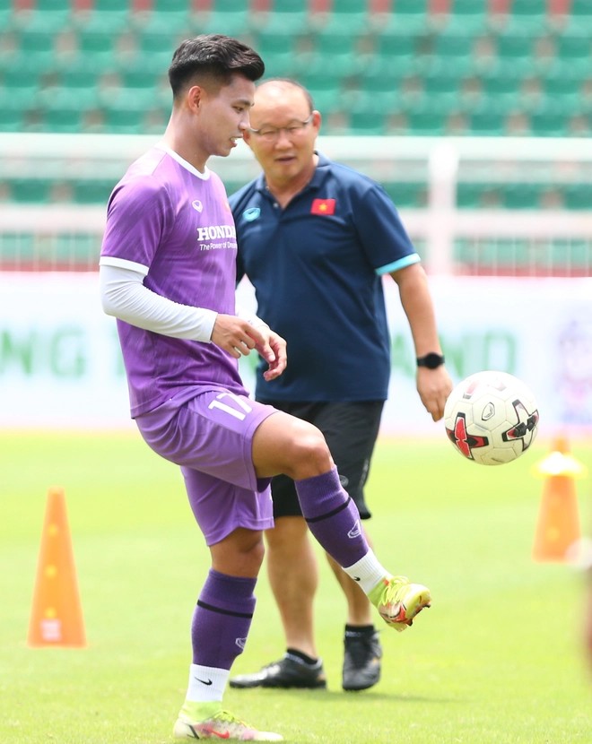 Về lý do bất ngờ đổi lịch, HLV Park Hang-seo cho biết: "Xin lỗi vì lịch tập thay đổi, thay vìtập chiều nhưng đổi sang tập trưa, vì 90% chiều nay có thể mưa nên đổi lịch tập sáng" (Ảnh: An Tô)