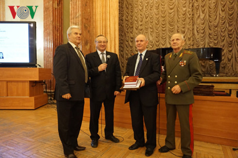 | Trao tặng sách cho CCB Kolesnik - Chủ tịch Hội CCB Nga từng công tác tại Việt Nam. (nguồn: vov.vn) |