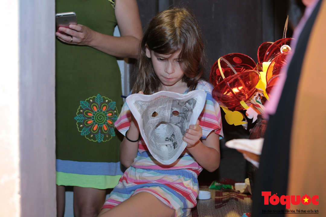 Sự kiện thu hút rất nhiều khách du lịch trong nước và nước ngoài đến tham dự. Nghệ nhân Nguyễn Văn Quyền đang hướng dẫn 2 du khách người Nga làm đèn kéo quân. |