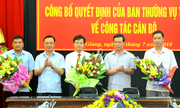 Bí thư Tỉnh ủy Hà Giang Triệu Tài Vinh (thứ 2 phải sang) trao các quyết định về nhân sự |