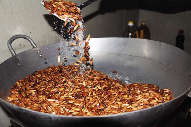 Mứt hạt bàng ngọt: cho đường cát trắng vào chảo với một chút nước, đun nhỏ lửa cho đến khi đường hơi sền sệt thì cho hạt bàng vào và đảo đều tay cho tới lúc đường khô là tắt bếp.