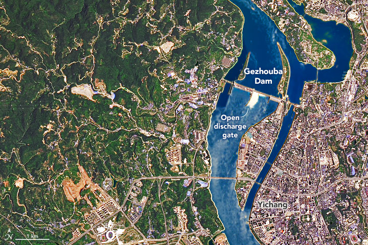 Hoạt động xả lũ này có thể được thấy qua những bức ảnh vệ tinh được NASA cung cấp. Các bức hình đã được xử lí màu sắc lại để nhìn rõ các dòng nước lũ hơn. Khi dòng chảy trôi xuống các cửa xả, dòng chảy sẽ có màu trắng ở trên ảnh.