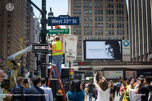 Thị trưởng thành phố New York Bill de Blasio đã công bố quyết định đổi tên tạm thời của đường West 33rd gần đấu trường MSG, nơi diễn ra những cuộc so tài vĩ đại nhất của Muhammed Ali tại kinh đô giải trí của nước Mỹ.