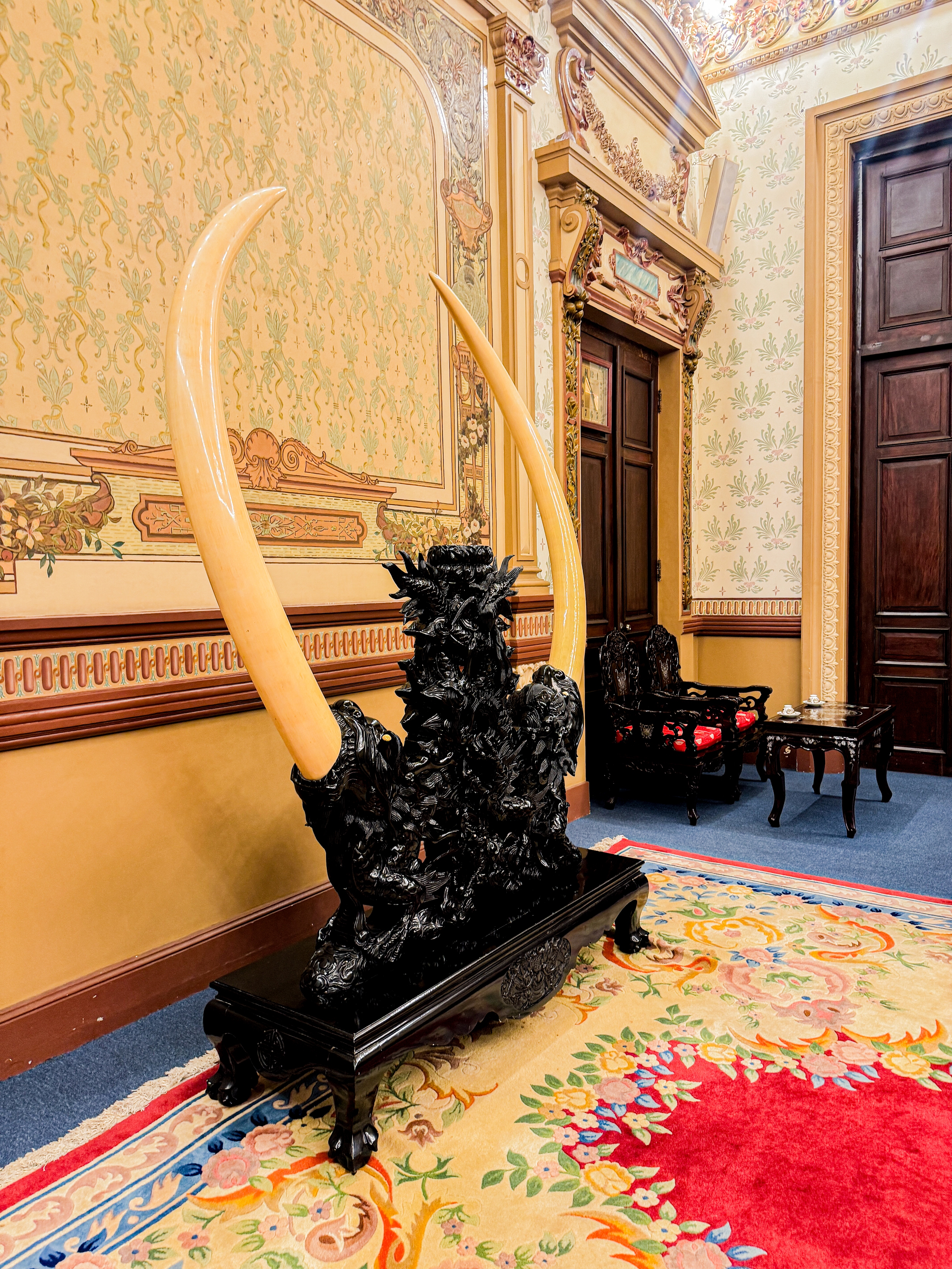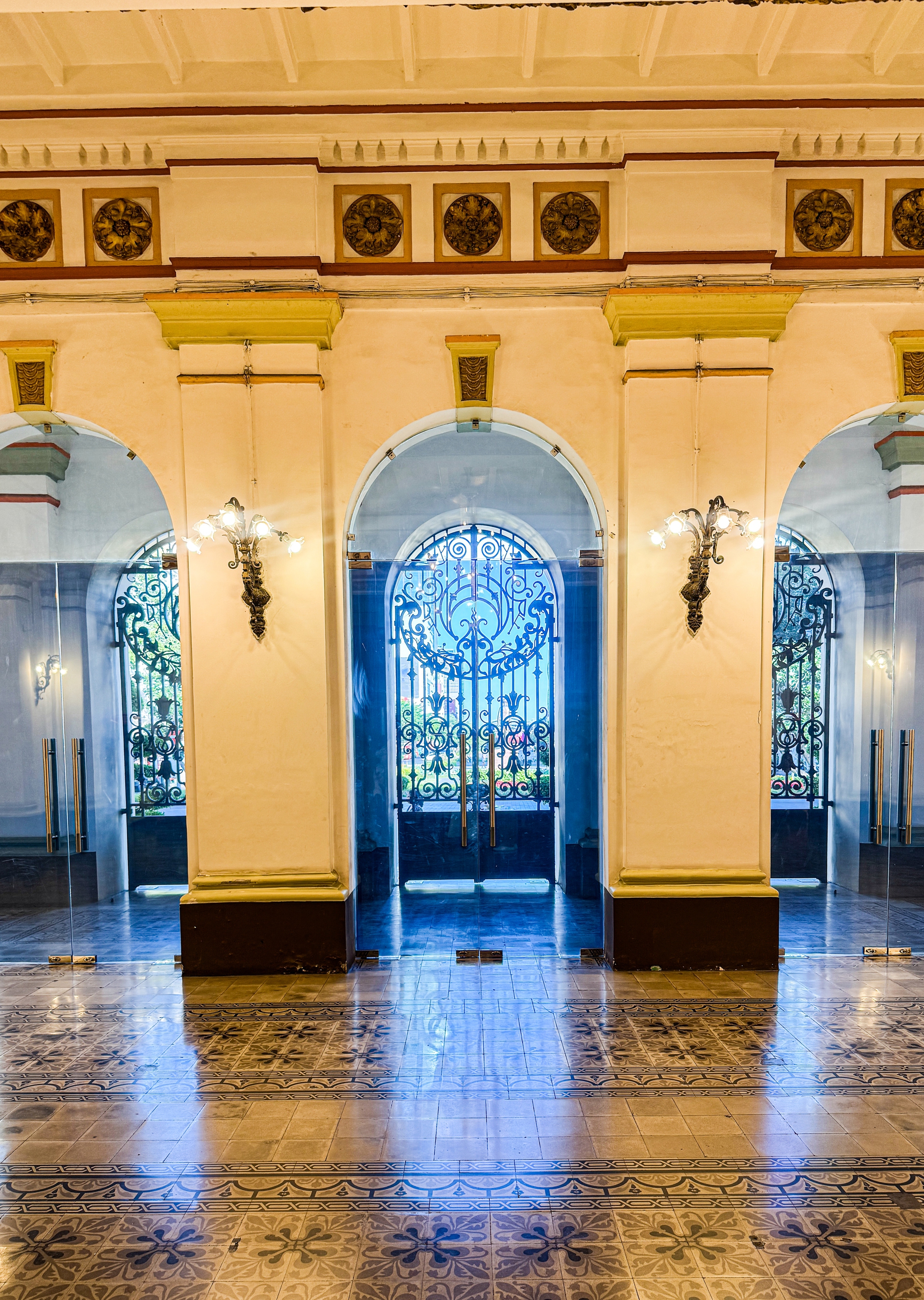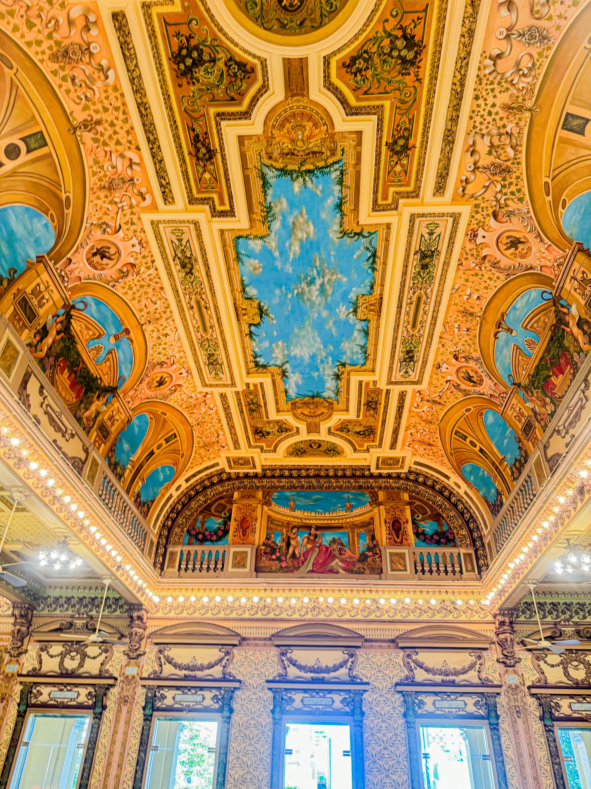 Từ cổng chính dẫn vào sảnh lớn giữa, các bạn sẽ đi đến cầu thang dẫn lên lầu trên. Phía trên là các phòng tiếp khách. Có thể thấy tường và trần nhà tại khu vực tầng 2 được vẽ hình ảnh vòng hoa, lá cọ, cành nguyệt quế, thiên sứ... của thời kỳ văn hóa Phục hưng, làm nổi bật vẻ đẹp nghệ thuật của không gian bên trong tòa nhà.