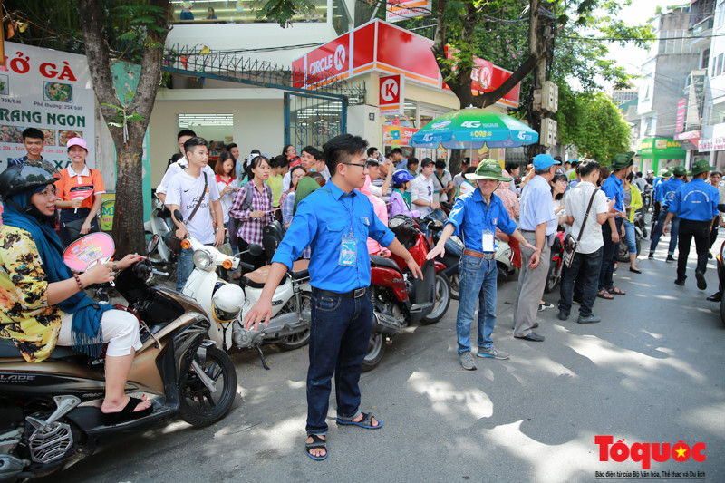 Phía ngoài cổng trường thi, nhiều đội tình nguyện, đội tiếp sức đến từ Đoàn thanh niên, các doanh nghiệp phát nước và quạt miễn phí cho thí sinh và phụ huynh. |