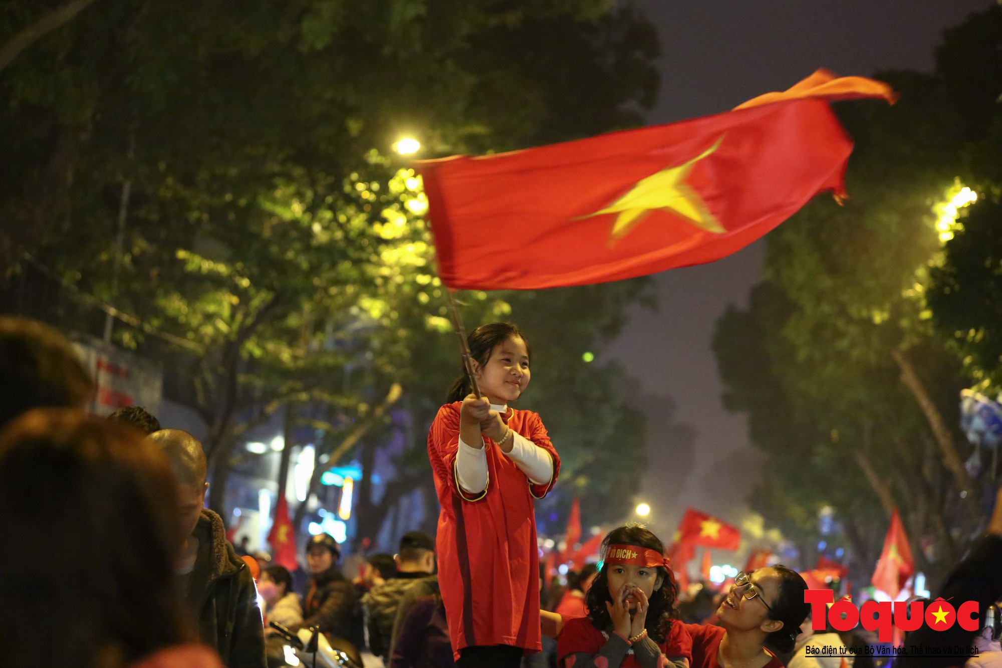 Ngay sau khi trọng tài nổi hồi còi kết thúc trận đấu giữa tuyển Việt Nam và Jordan, các con phố dẫn về Hồ Gươm chật cứng người với sắc màu đỏ rực của cờ, hoa và những tiếng hô vang "Việt Nam vô địch".